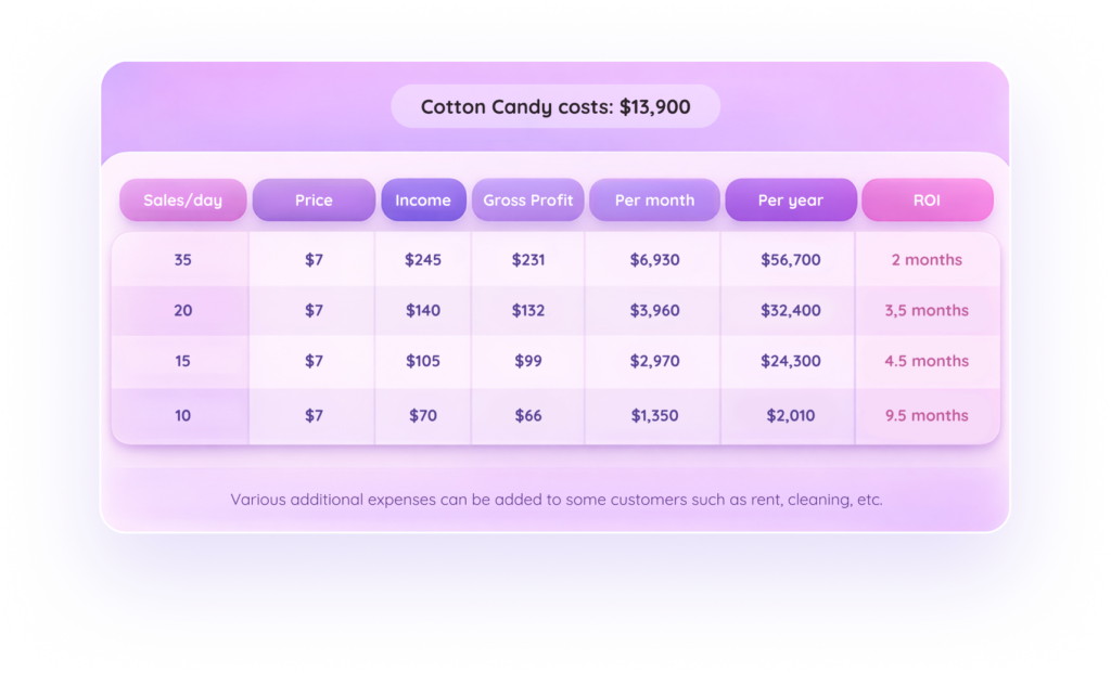 sweet tooth anytime, anywhere. No need to wait in line – simply purchase fresh spun sugar on demand. Place a machine in high-traffic indoor or outdoor areas for around-the-clock accessibility. Commuters can pick up pink treats for the road. Sports fans fuel up between innings. Kids stay entertained all day at family destinations. Your machine becomes a one-stop sugar shop!